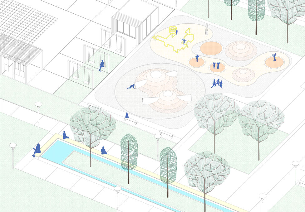 The landscape design layers are flexible and reachable for everyone. Public open space provides diverse recreational, social, and leisure opportunities with facilities catered for the users of Hastahana Park. Developing a design language in The Hastahana Park that responds to the need for flexible, social, active, robust, and vibrant space and that includes an area to “produce and learn”. On the north side of the park, an active and dynamic square creates lots of opportunities for different events and cultural activities. The center stage has parts that can rise to a certain extent within the platform. This platform can be transformed into a dance floor and at the same time become a concert area with an amphitheater. On the east side of the center, a playground is located. This area contains fun surfaces and layers. Children experience different layers with artificial topographies and play materials.